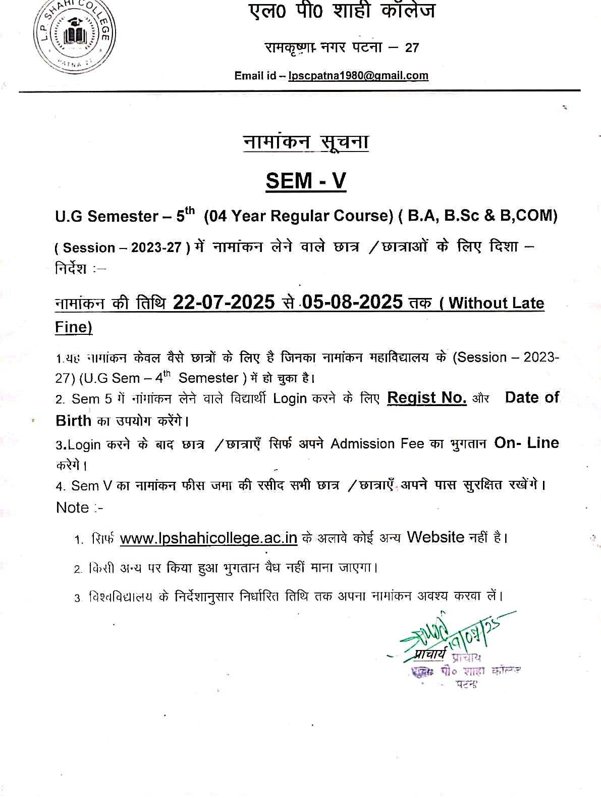 5th semester fee payment
